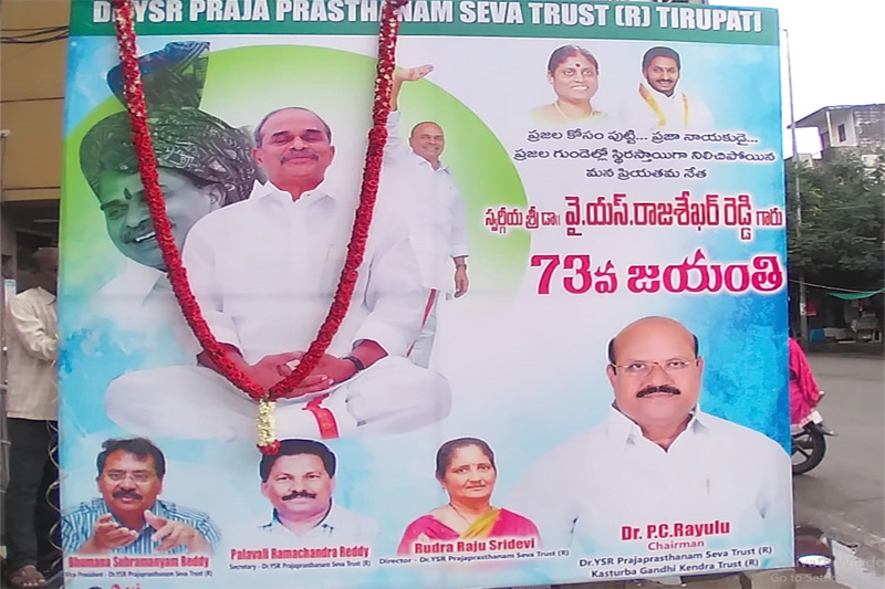 Dr.Y.S.Rajasekhar Reddy’s 74th Birthday was being organised by Dr.Y.S.R Praja Prasthanam Seva Trust (R) in AIR Bypass Road, Tirupati at 08.07.2023. On this occasion, Chairman of the Trust Dr.P.C Rayulu paid a great Tribute to Dr.Y.S.R.